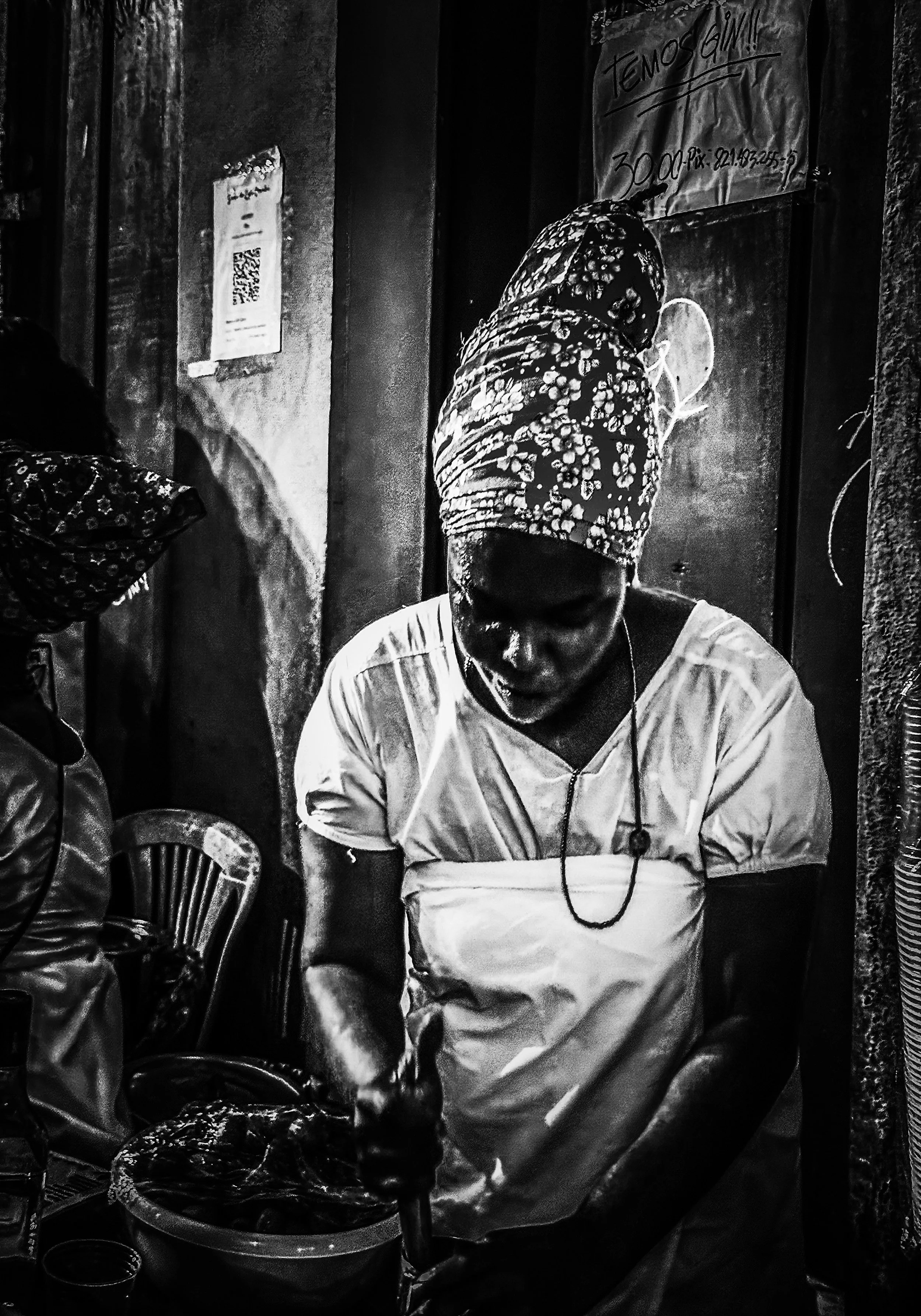 Fotografia documental que retrata o gesto cotidiano de preparo de alimento, protagonizado por uma mulher afro-brasileira em contexto popular. A imagem destaca o trabalho manual como expressão de sustento, cuidado e continuidade cultural.