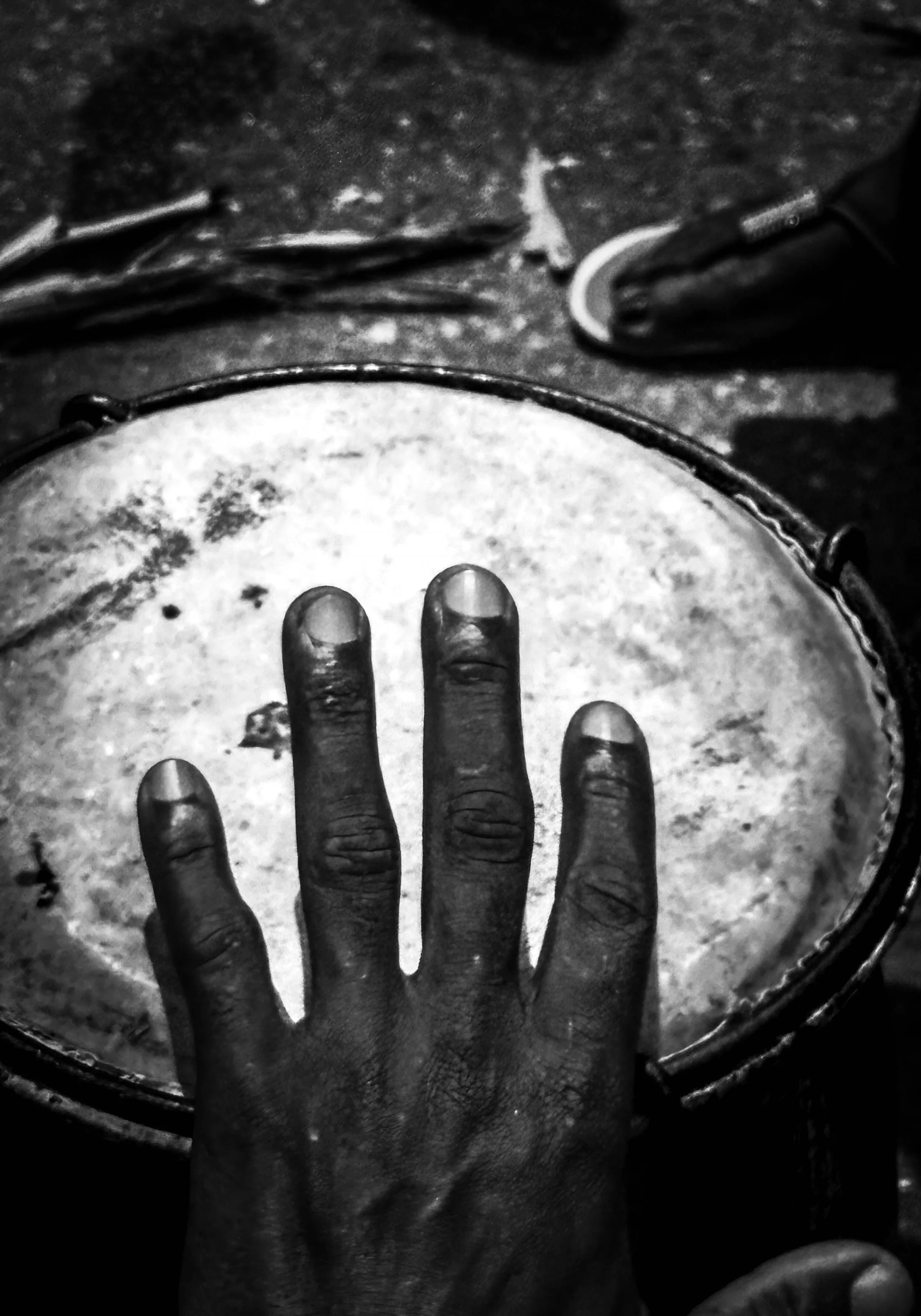 Fotografia documental que registra o gesto direto de uma mão sobre o tambor, elemento central nas práticas culturais e religiosas de matriz afro-brasileira. A imagem enfatiza o contato físico entre corpo e instrumento, onde o som nasce do toque, da repetição e da memória ancestral.